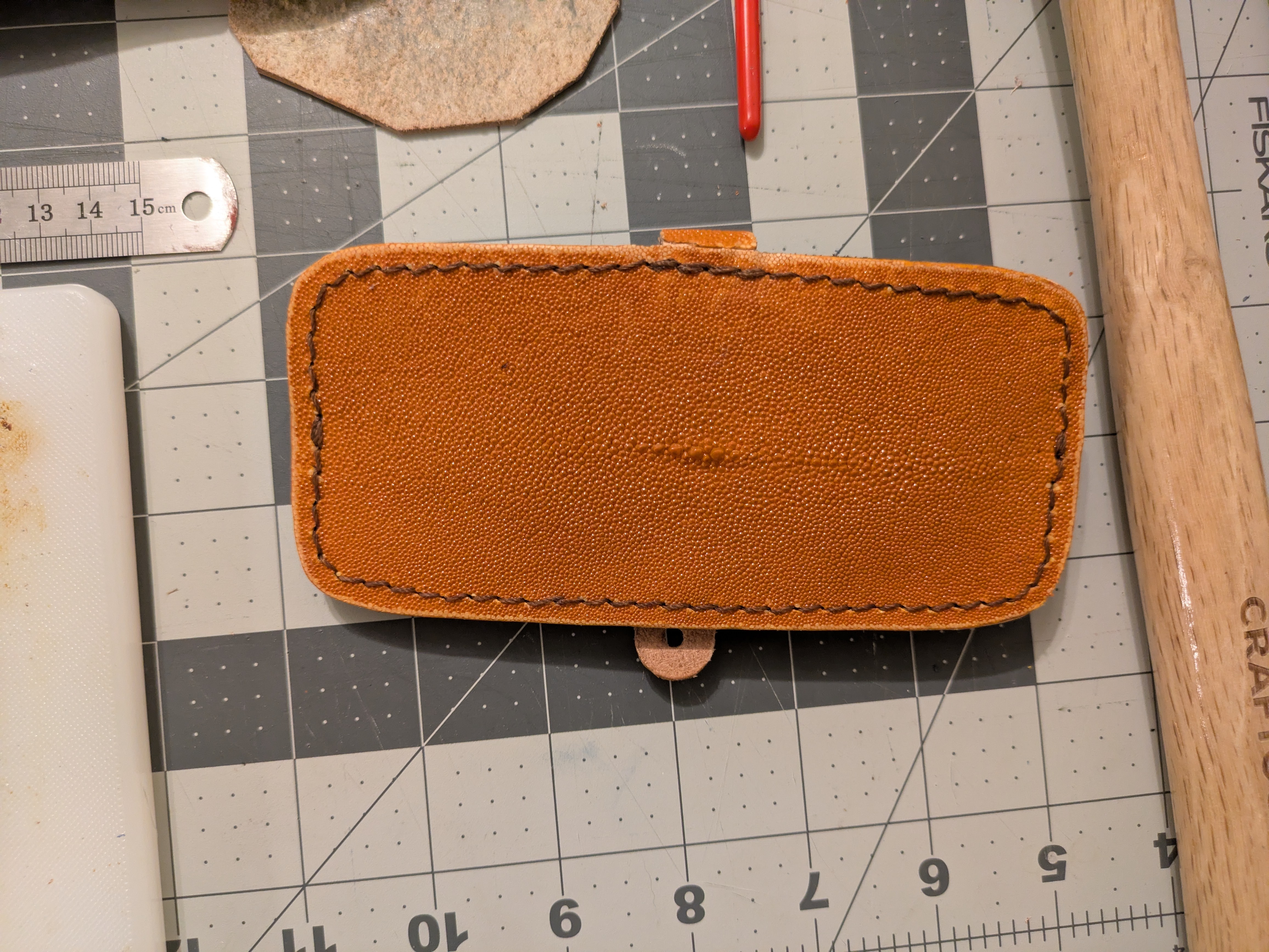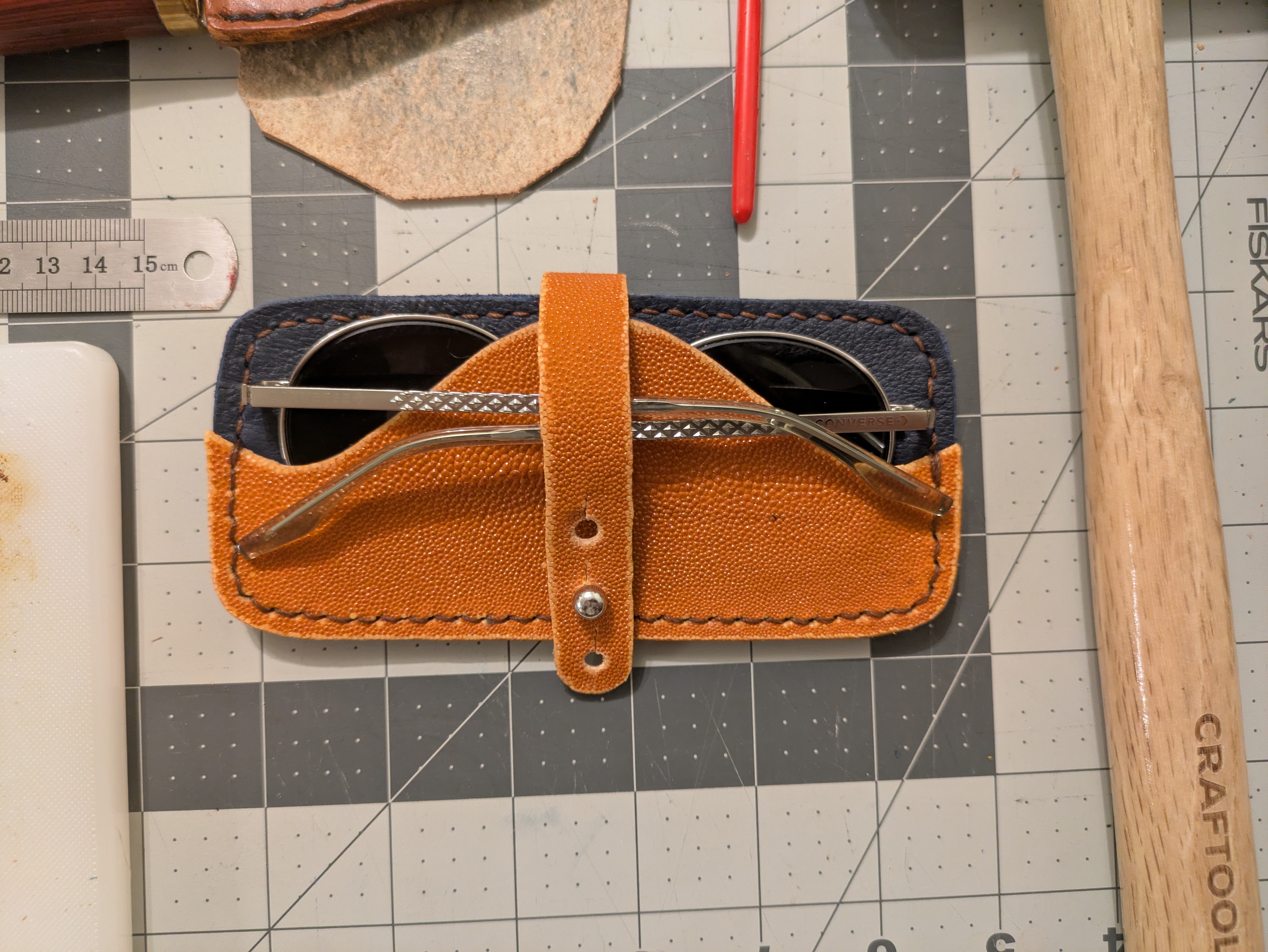 I made this sunglasses case because I had two pieces of stingray leather I got on clearance from Tandy Leather on a whim and didn’t know what to do with. They were juuuuuuust big enough for this to be a practical choice, and I hated having a big chunky sunglasses case that I couldn’t really carry around with me.